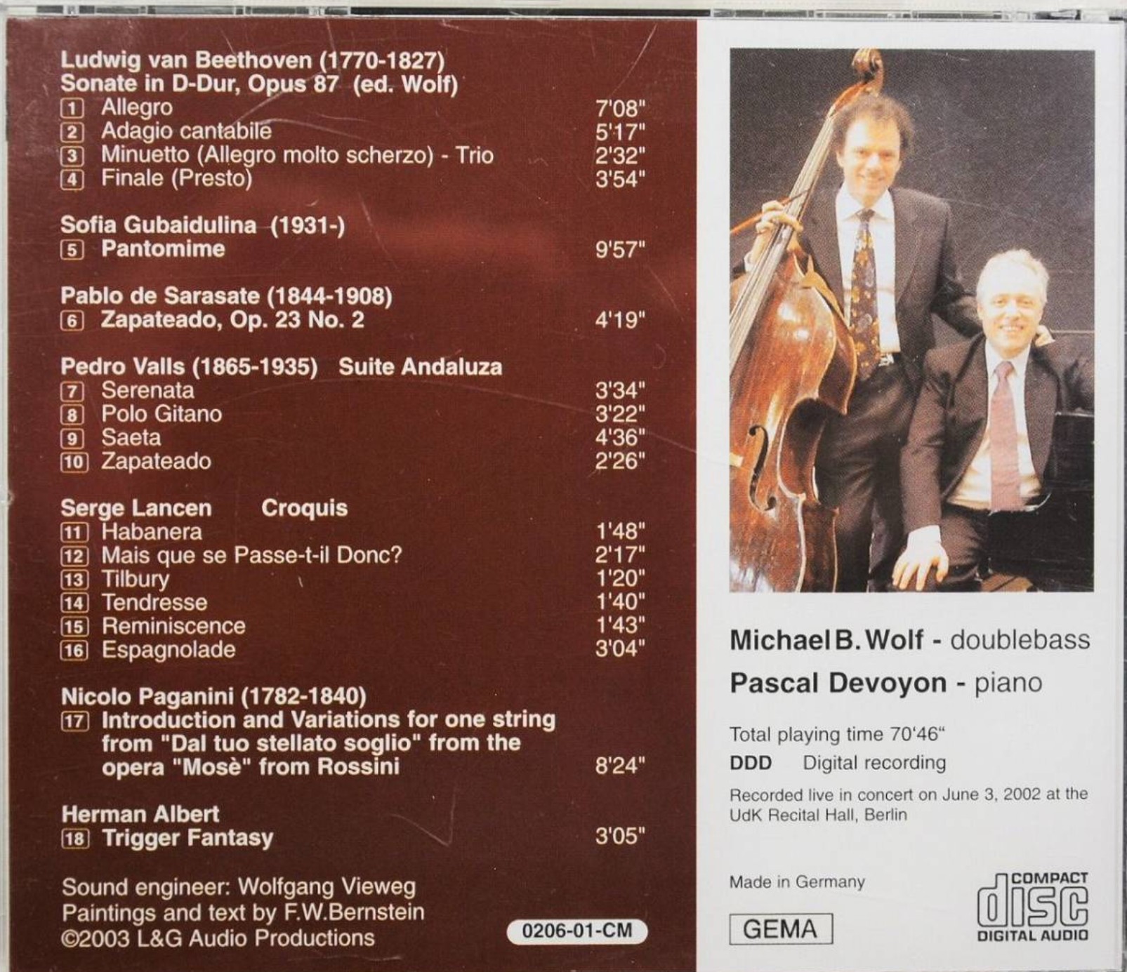 収録曲![]() 画像をクリック! Michael Wolf(doublebass),Pascal DEVOYON(pf) | ||